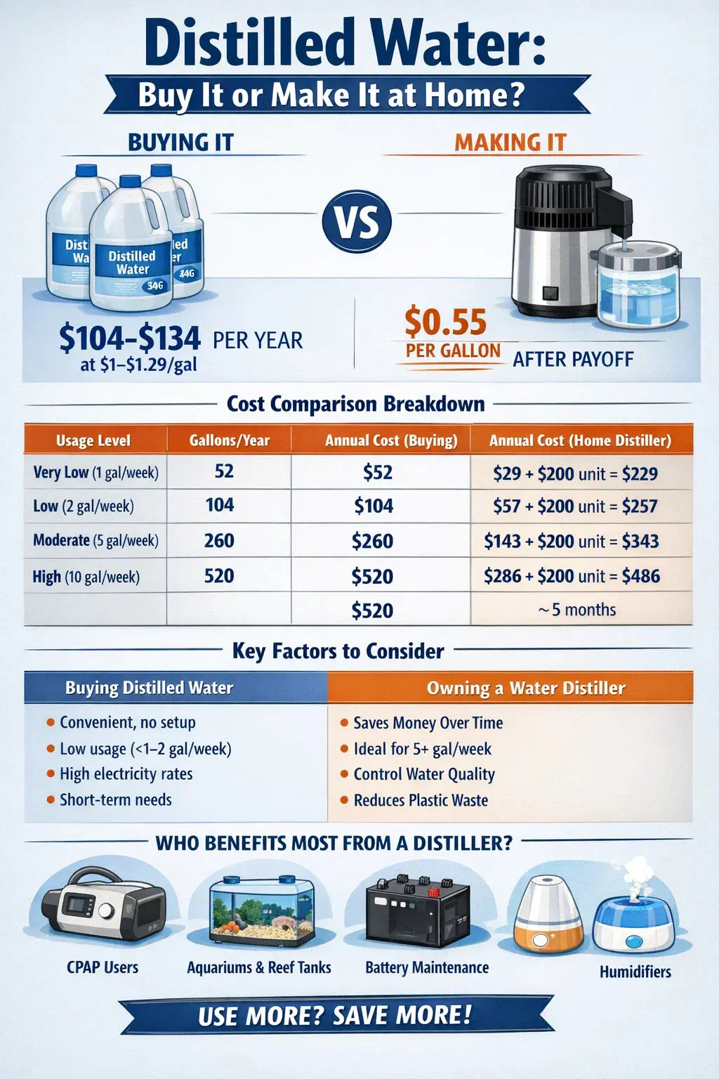 Användningen skalar också snabbt. CPAP-maskiner använder cirka 1 gallon per vecka i genomsnitt. En luftfuktare som går igenom vintern kan förbruka ytterligare 1–2 liter per vecka. Ett saltvattensakvarium som behöver regelbundna påfyllningar kan kräva 3–5 liter per vecka. Blybatterier i en solcellsinstallation eller reservkraftbank behöver periodiskt destillerat vatten. Stapla dessa användningsområden och 5–10 liter per vecka är inte ovanligt, vilket skjuter upp de årliga butiksköpta kostnaderna till 260 USD–520 USD per år eller mer.