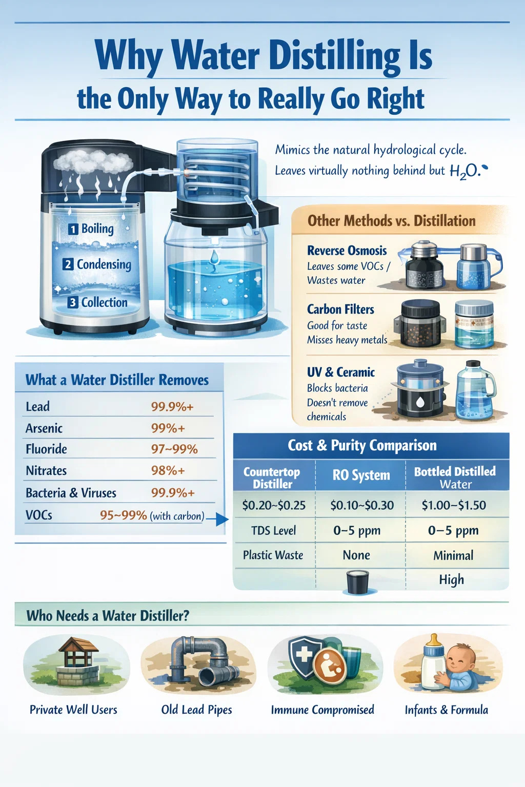 Andra filtreringsmetoder är selektiva. De riktar sig mot vissa föroreningar men låter andra passera. Ett kolfilter tar bort klorsmaken vackert men gör nästan ingenting åt löst bly eller nitrater. Omvänd osmos tar bort ett brett spektrum av föroreningar men kämpar med vissa flyktiga organiska föreningar som avdunstar precis tillsammans med vattenångan under membrantrycket. En vattendestillerare diskriminerar inte. Processen i sig är mekanismen, och fysiken gör inga undantag baserat på föroreningstyp.
