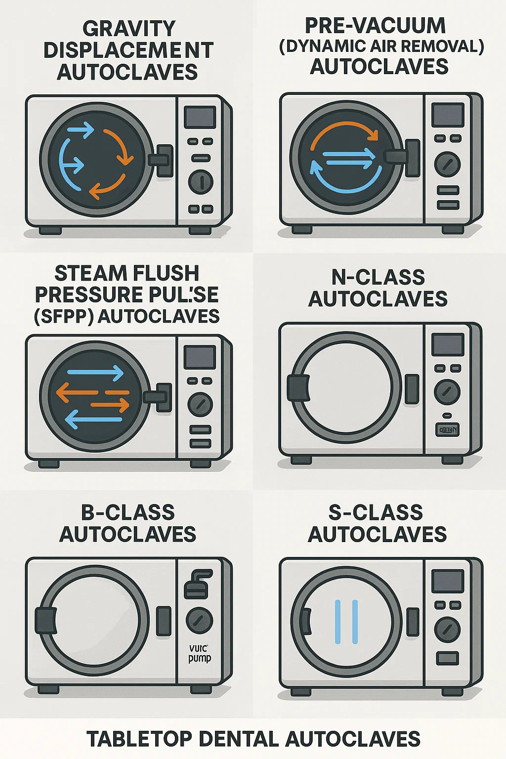 | Förvakuum (klass B) | Vakuum tar bort luft innan ånga kommer in | Inslagna förpackningar, ihåliga verktyg (handstycken, sprutor) | Kliniker som följer strikta steriliseringsstandarder |