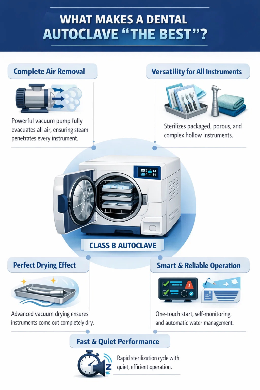 På en hektisk klinik är hastighet lika med effektivitet. De bästa sterilisatorerna kan förkorta hela cykeltiden så mycket som möjligt samtidigt som de säkerställer effektivitet. Samtidigt bör deras verksamhet vara väldigt tyst, för att inte störa den fridfulla kliniska miljön.