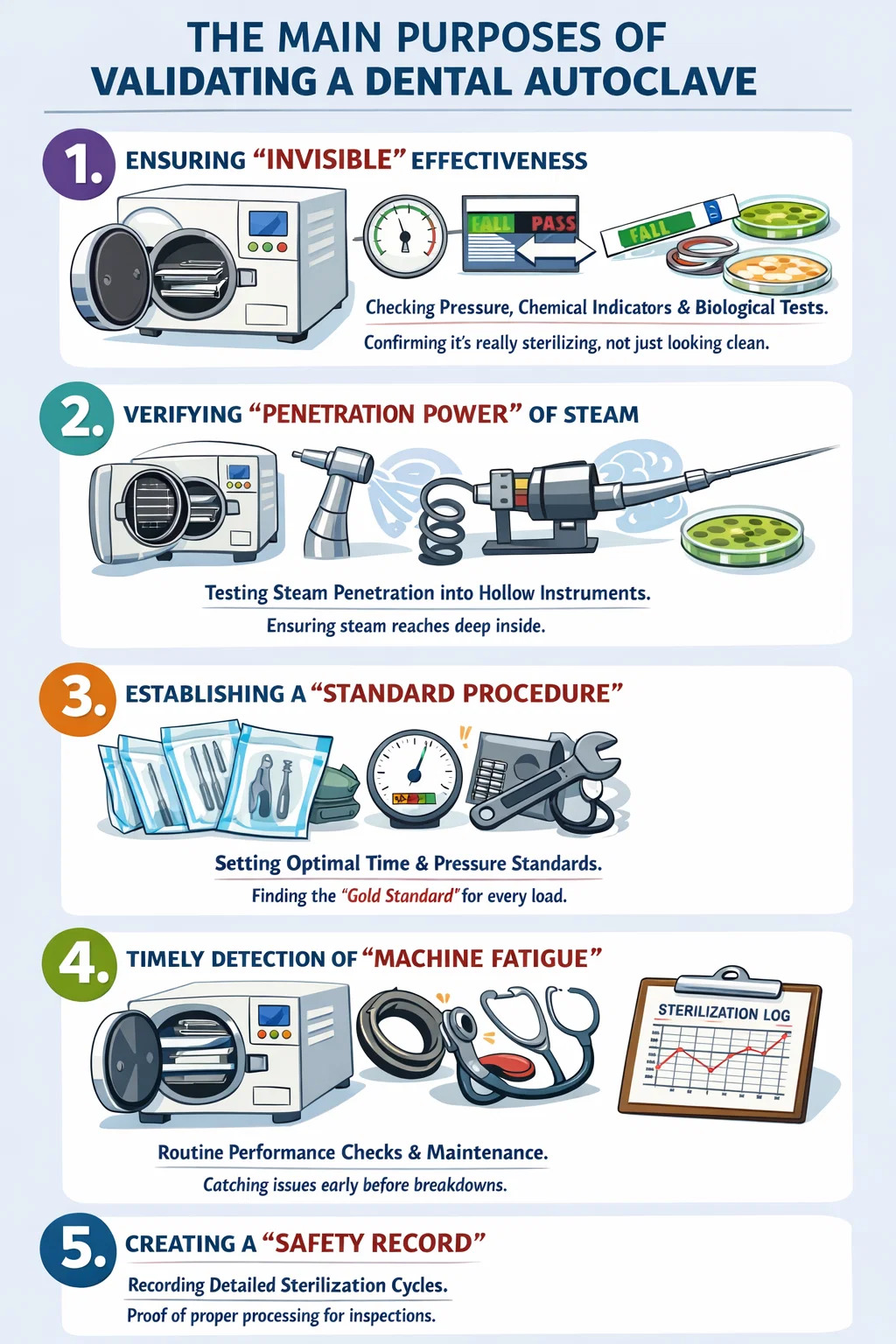 Valideringen av en dental autoklav Enkelt uttryckt är att ge en "dubbel garanti" för steriliseringseffekten. Även om maskinen körs varje dag, säkerställer validering att den utför sitt jobb effektivt varje gång.