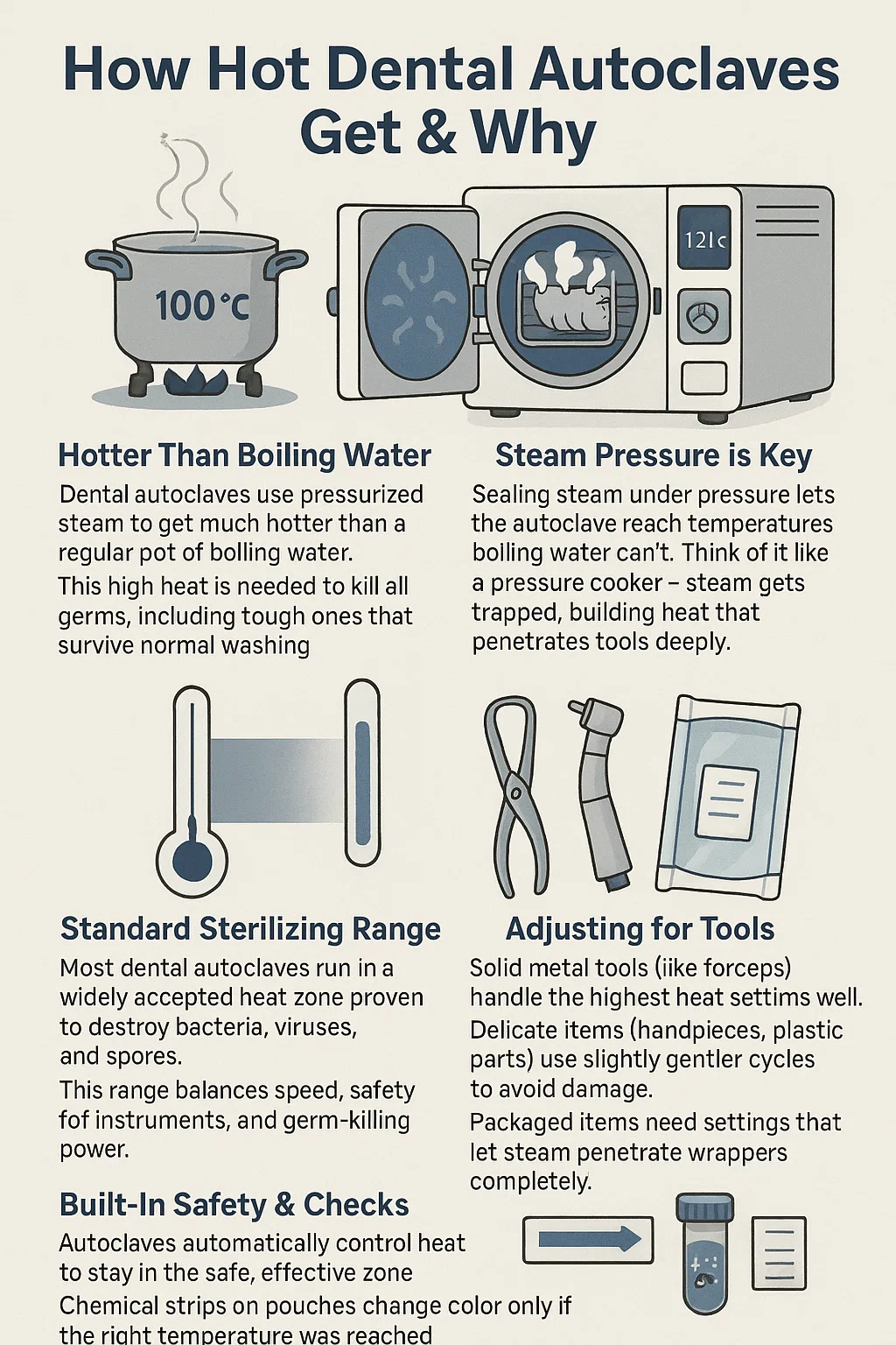 De flesta tandautoklaver körs i en allmänt accepterad värmezon som visat sig förstöra bakterier, virus och sporer.